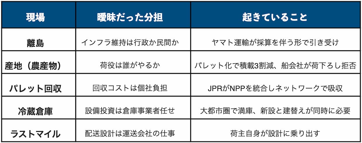 だが制度に先立ち、食品物流の現場はすでに動き始めていた。離島では民間企業がインフラの代替を担い、農産物の産地では段ボール箱の規格をめぐる利害調整が続く。都市部ではコンビニチェーンが自ら配送設計を見直し始めた。温度管理、賞味期限、多頻度小口配送、廃棄リスクという食品特有の制約が、負担の分担を曖昧にしたまま運用することを許してきた。従来の分担では回らなくなった。いずれの現場でも、「誰がコストを負い、誰が責任を持つのか」が問い直されている。(編集長・赤澤裕介)