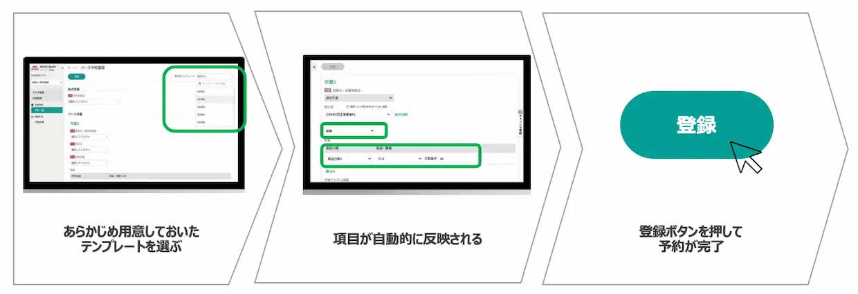 新機能では、拠点や時間帯、物量などの予約内容をテンプレートとして保存し、次回以降は変更項目のみ入力することで、より速く正確に予約が可能となる。これにより入力ミス防止や作業時間短縮に加え、チーム内での業務分担も容易になる。