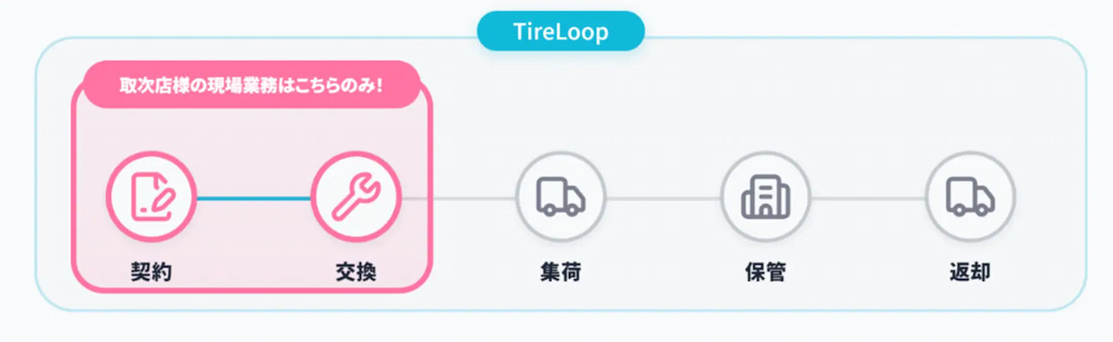 AI(人工知能)を活用したタイヤ状態の自動データ化や、契約・顧客管理の一元化、倉庫・配送との連携機能を備え、作業負荷の軽減と運用効率の向上を支援する。導入後は、集荷や保管、返却、契約管理、交換案内までを一括で代行し、取次店は契約対応と交換作業に専念できる体制を構築する。