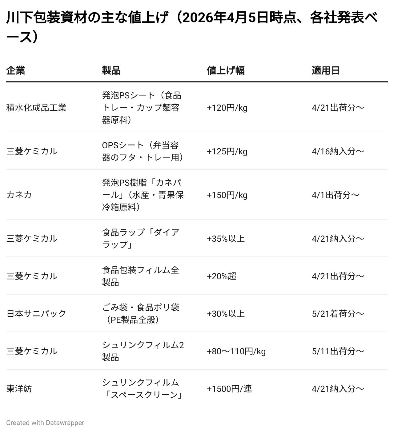 PSの薄さは単独の問題ではない。PS系からPE・PP系、収縮フィルムへと値上げが広がっている。以下は4月5日時点で確認できた主な川下の値上げだ(各社発表ベース)。