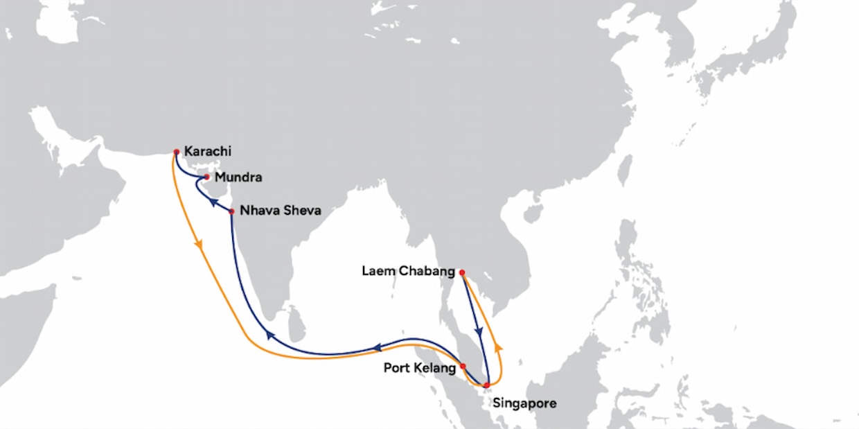 新航路は、レムチャバン、シンガポール、ポートクラン、ナバシェバ、ムンドラ、カラチなどを結ぶローテーションで運航し、インド西海岸とパキスタンを含む広域ネットワークをカバーする。東南アジアとインド・パキスタン間の直行サービスを提供することで、輸送のリードタイム短縮と接続性の向上を図る。