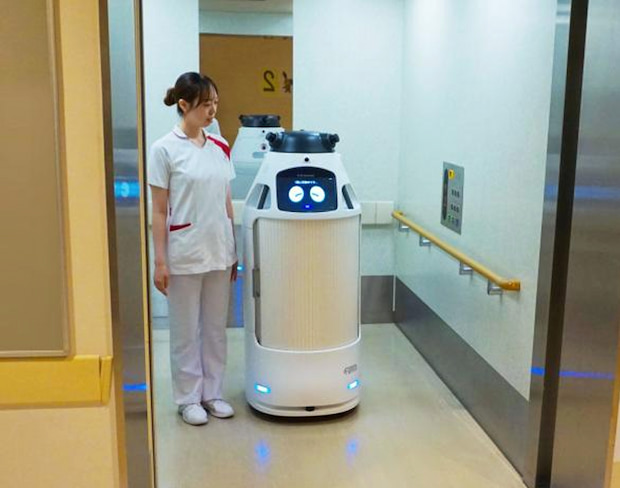 同ロボットは院内の検体や薬剤などの配送業務を担い、医療従事者の負担軽減と業務効率化を目的とする。広範囲センシングによる安全走行に加え、異なるメーカーのエレベーターとの連携やセキュリティドアの通過機能を備え、複数棟・複数階にわたる長距離配送が可能。