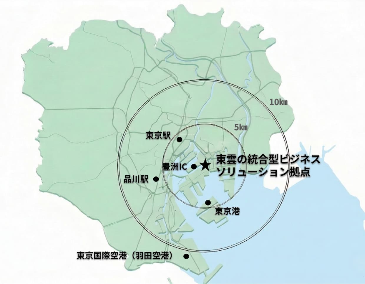 立地は首都高速晴海線・豊洲インターチェンジから1.5キロ、銀座・日本橋から5キロ圏内と都心近接に位置する。東京港や羽田空港にも20分でアクセス可能で、広域配送と国際物流を横断した運用基盤となる。海外物流を含めたサプライチェーン全体の最適化拠点としての活用を見込む。