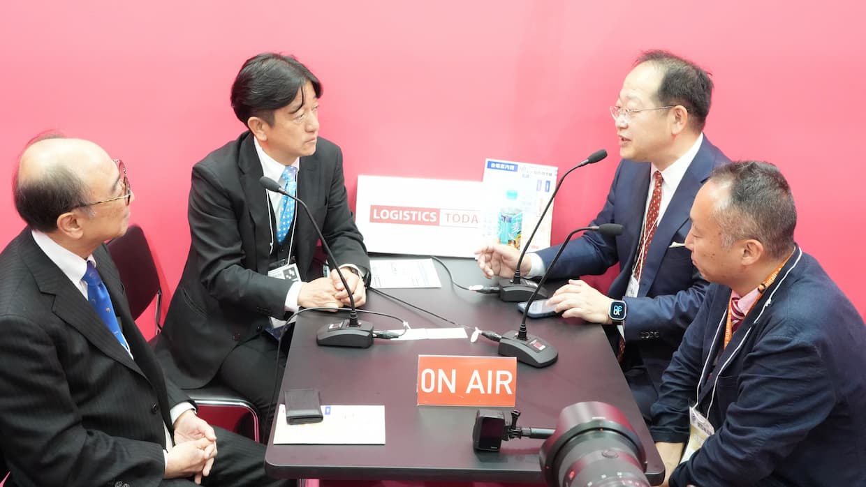 初日は、10時の開場と同時に赤澤裕介編集長が配信の趣旨説明。その後、ワンロジ(東京都新宿区)の吉岡泰一郎社長とともにホルムズ危機について解説を行った。配信中に国土交通省中国運輸局で全国のトラックGメンの活動を先導した田中幸久氏、運輸デジタルビジネス協議会(TDBC)の小島薫代表理事がブースを訪れ、トラック運送業を巡る物流課題についての配信を行った。小島氏は「物流関連の法整備で荷待ち時間の削減への関心が高まっている。全国の70%以上のトラックにはすでにデジタコが搭載されているが、デジタコの情報を活用すれば車両の動態管理ができるほか、ごく狭い場所を指定しての入出庫、接車などの記録を取ることも可能。すでに自社の車両に搭載されているデジタコを使って、荷待ち時間、ドライバーの労働時間の記録などに活用してほしい」と語った。