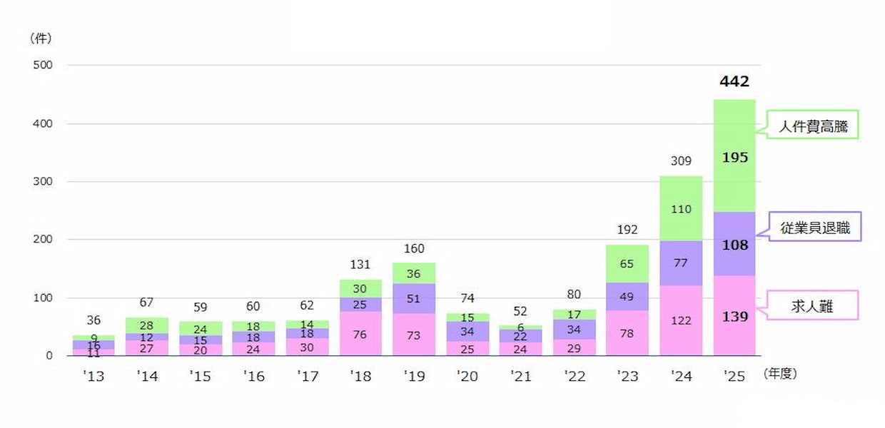 調査・データ東京商工リサーチ(TSR)が8日発表した2025年度(4-3月)の倒産動向によると、人手不足関連の倒産は442件となり、前年度比43.0%増と大幅に増加し、過去最多を更新した。