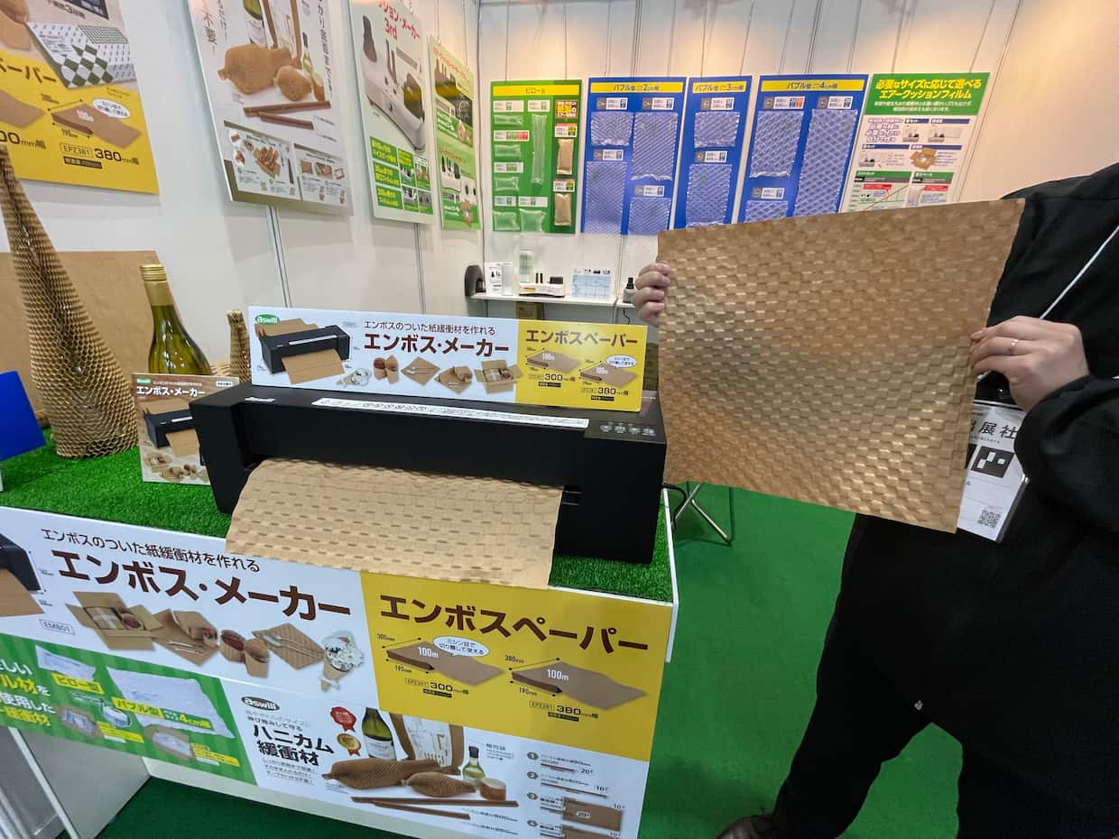 エンボス・メーカーは、専用の紙シートを、エンボスのついた紙緩衝材にできるツールである。横幅550ミリ、奥行き175ミリと卓上に設置して作業することも可能で、導入しやすい価格設定とともに、「小口のEC(電子商取引)などの事業スタートなどでの利用に最適」(担当者)と訴える。シンプルな操作で、3段階のスピード調整ができる仕様で、家庭用の電化製品同様の使い勝手の良さが特長である。