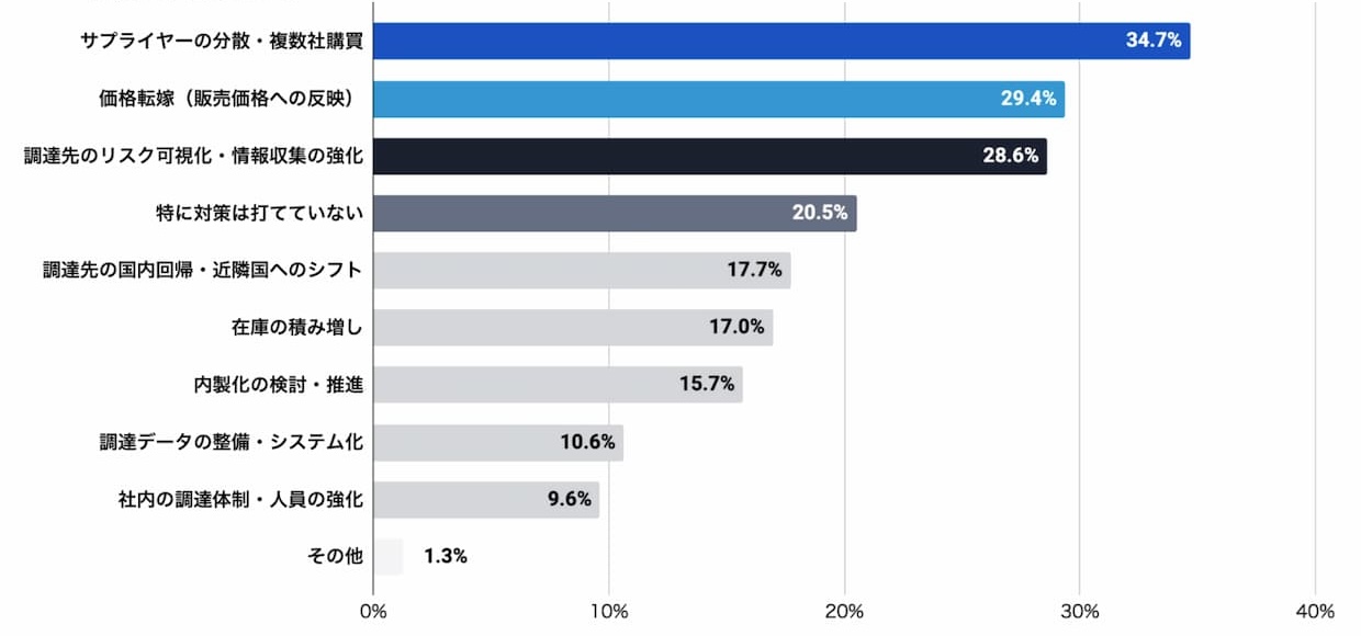 対応策としては、8割の企業が何らかの手を打っている。最も多いのは「サプライヤー分散・複数社購買」(34.7%)で、「価格転嫁」(29.4%)や「調達リスクの可視化・情報収集強化」(28.6%)が続いた。一方で「データ整備・システム化」や「体制強化」といった中長期的施策は1割前後にとどまり、即効性を優先した対処療法的な対応が主流となっている。