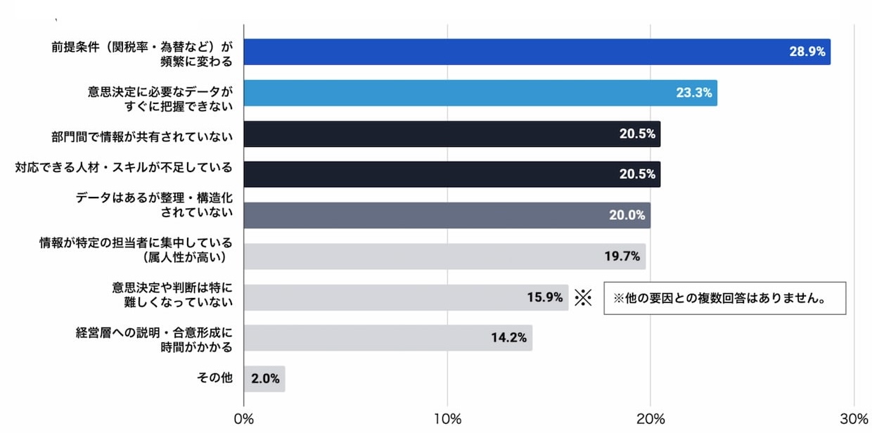 調達リスクへの対応体制については、「整っていない」「どちらかといえば整っていない」との回答が5割に達した。業務負荷の増大と体制整備の遅れが同時に進行しており、現場対応が後手に回る構造が示唆される。意思決定を難しくしている要因としては「前提条件が頻繁に変わる」が28.9%で最多となり、「必要なデータが即時に把握できない」「部門間で情報が共有されていない」「対応できる人材・スキル不足」が続いた。環境変化のスピードに対し、情報と組織が追いついていない実態が明らかになった。