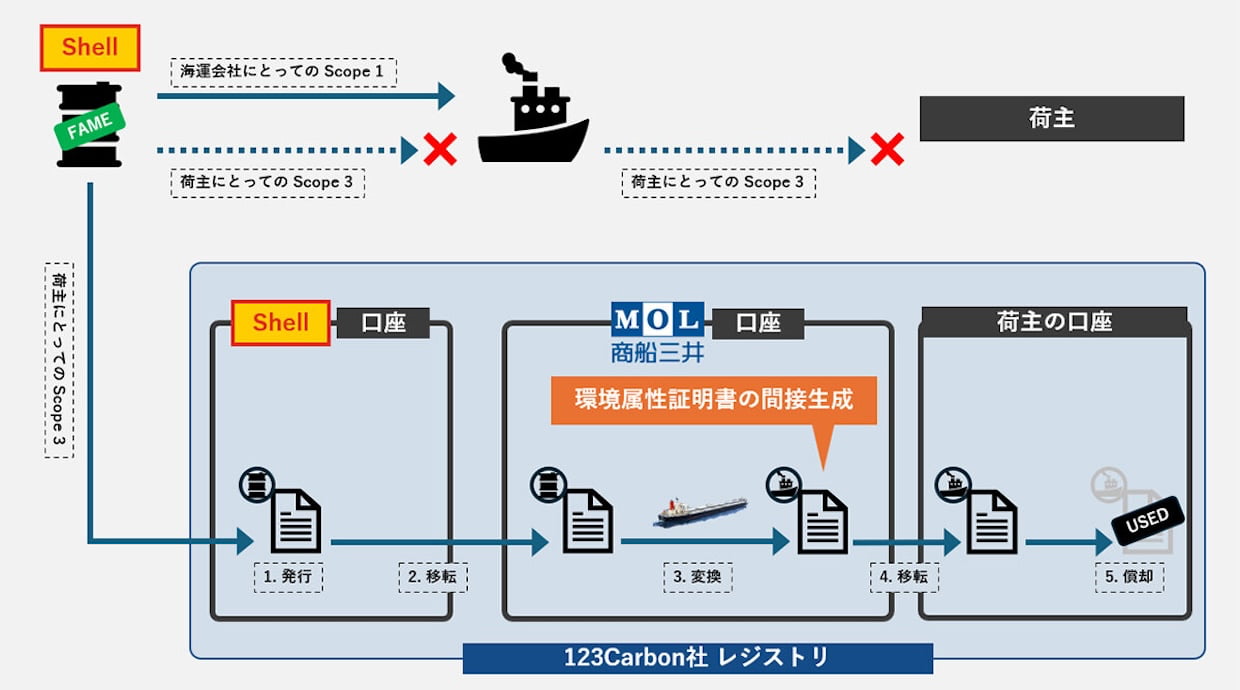この仕組みでは、シェルが第三者の海運会社の燃料を化石燃料から低炭素バイオ燃料へ転換し、その削減効果をオランダの第三者管理会社・123カーボンのデータ管理基盤に登録する。商船三井はその削減効果を受け取り、国際NPOであるスマート・フレイト・センター(SFC)が定める国際ルールに基づいて第三者検証を経たうえで環境属性証明書に変換し、自社の荷主向けプログラム「BLUE ACTION NET-ZERO ALLIANCE」を通じて顧客に提供する。