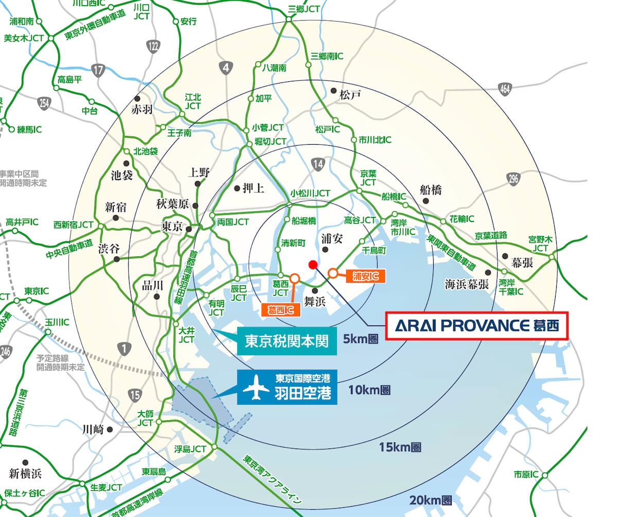 アライプロバンス葛西は10キロ圏内に城東エリアを収め、15キロ圏内には品川、東京などの消費地のほか、羽田空港もあり、航空便との連携も容易。(出所:アライプロバンス)