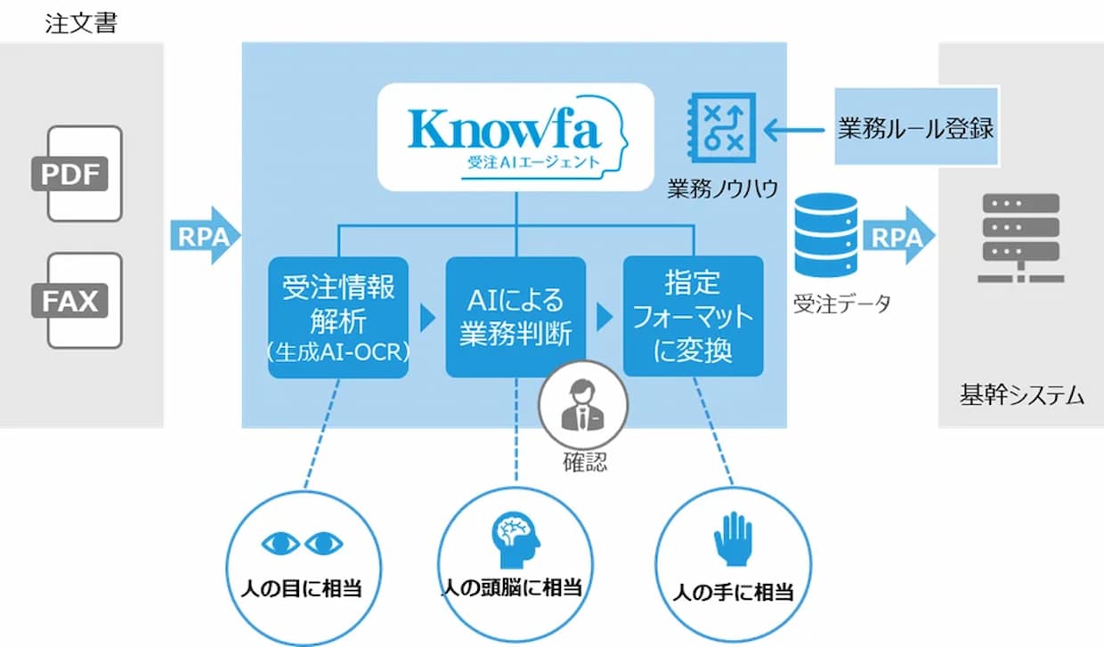 製造業や食品業界では、注文書の表記揺れなどにより入力業務が属人化し、習熟に約1年を要するなど人材依存が課題となっている。同サービスは、生成AI-OCRによる情報認識、業務ルールと過去データに基づく判断、基幹システム向けデータ出力を組み合わせ、受注処理の自動化を図る。