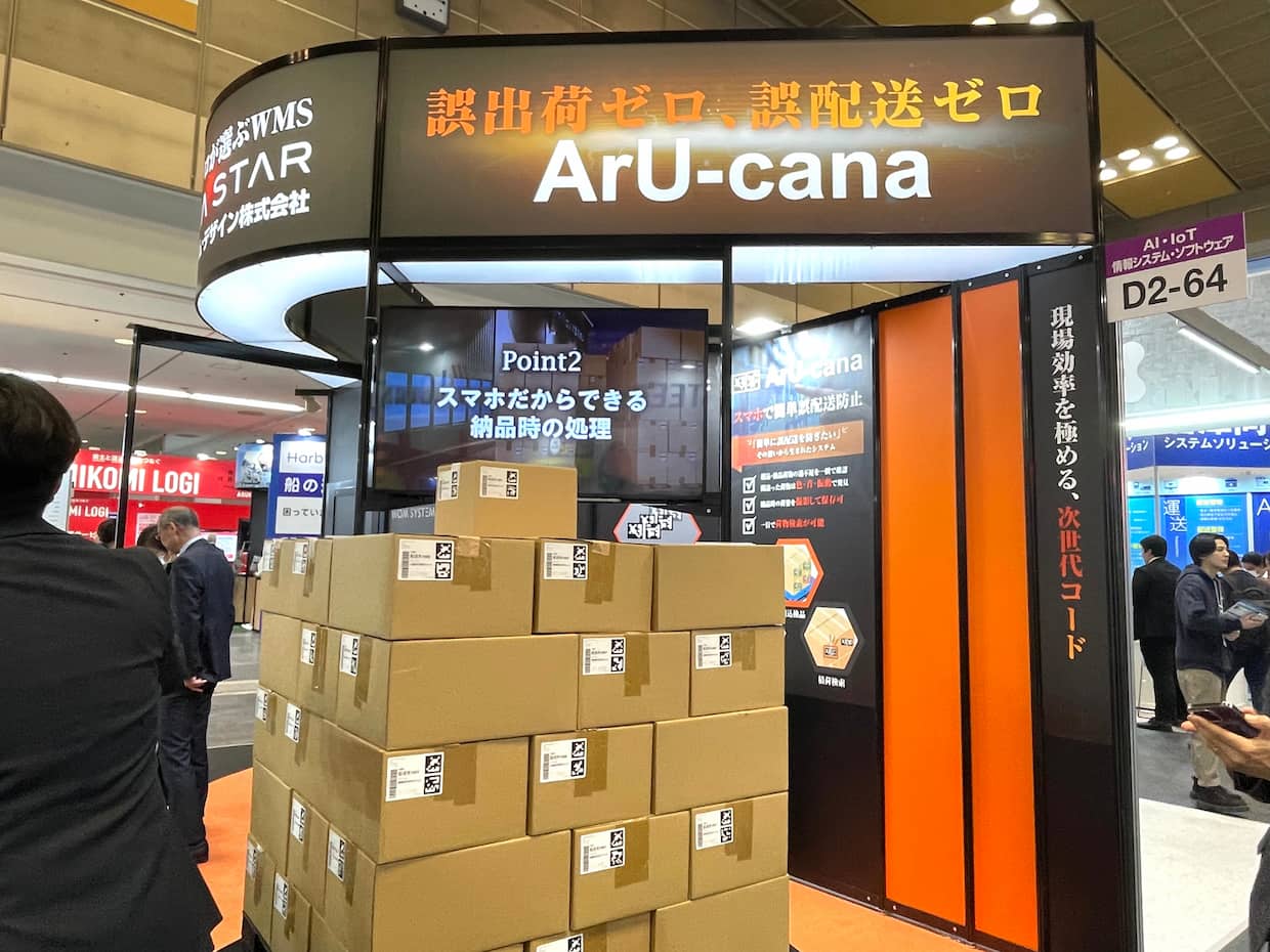 アルカナは、自社開発の独自二次元コード「ArU-code」(アルコード)を使い、複数の荷物を一括読み取りすることで、過不足や誤った商品を瞬時に検知できるシステムである。スマートフォンをかざすだけで検品でき、色表示、音、振動による直感的なアラートで、誰でも確実に検品できる機能を実演した。荷札にコードを追加するだけで導入できるため、低コスト、短期間で現場の検品精度と作業効率を高められる。