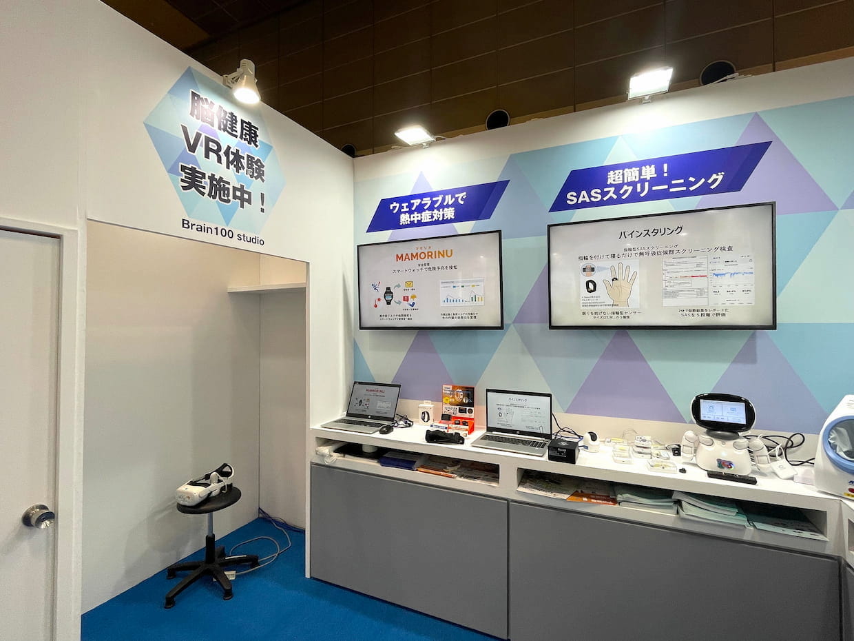 多様なソリューション提案の中でも、「Brain100 studio」は体験ブースを用意。VR(仮想現実)を使って脳の健康状態や認知機能の低下リスクを早期に見える化するサービスを体感できる。「ゲーム感覚で気軽にチェックできることで、課題の早期発見につなげたい」と担当者は語る。