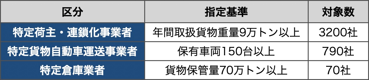特定荷主・連鎖化事業者、特定貨物自動車運送事業者、特定倉庫業者の3区分が指定の対象となる。義務内容はCLOの選任、2026年10月末を初回期限とする中長期計画の提出、定期報告で、違反時は勧告、企業名公表、命令、罰金の順で措置される。対象は3区分を合わせて4000社規模に及ぶ。