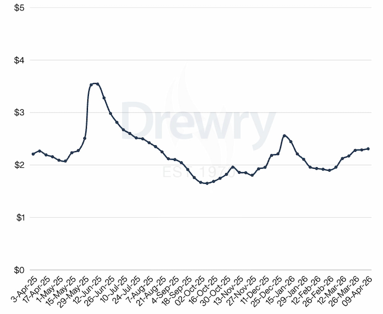 調査・データ英調査会社のドリューリーは9日、世界コンテナ指数(WCI)が前週比1%上昇し、40フィートコンテナ1個あたり2309ドルとなったと発表した。