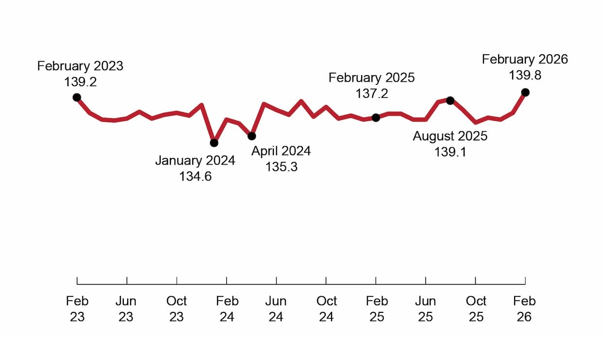 調査・データ米運輸省統計局(BTS)が9日に発表した2月の貨物輸送サービス指数(Freight TSI)は139.8となり、前月比1.5%上昇した。2か月連続の上昇で、前年同月比でも1.9%の伸びとなった。