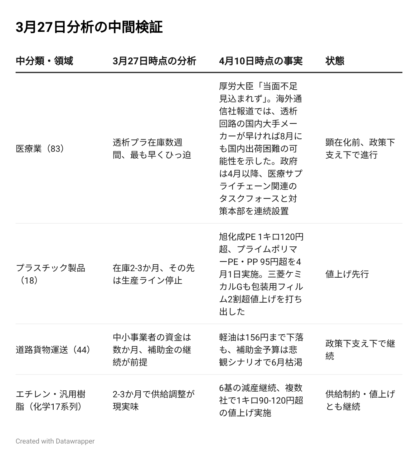 注:3月27日記事「備蓄放出でも届かないナフサ、21中分類に連鎖」で示した時間軸の分析のうち、主要4領域を抜粋して中間検証した。建設業を含む全21中分類の状態整理は追って稿を改める。