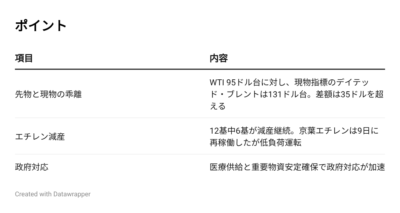分析のうち、汎用樹脂は「2-3か月」と見ていたが、封鎖から6週間で1キロ90円超の値上げが実施に入った。運送は分水嶺の手前にあり、医療資材の不足はなお顕在化していない。ただ、政府が供給点検や連絡窓口の整備を矢継ぎ早に進めていることは、平時対応ではない。