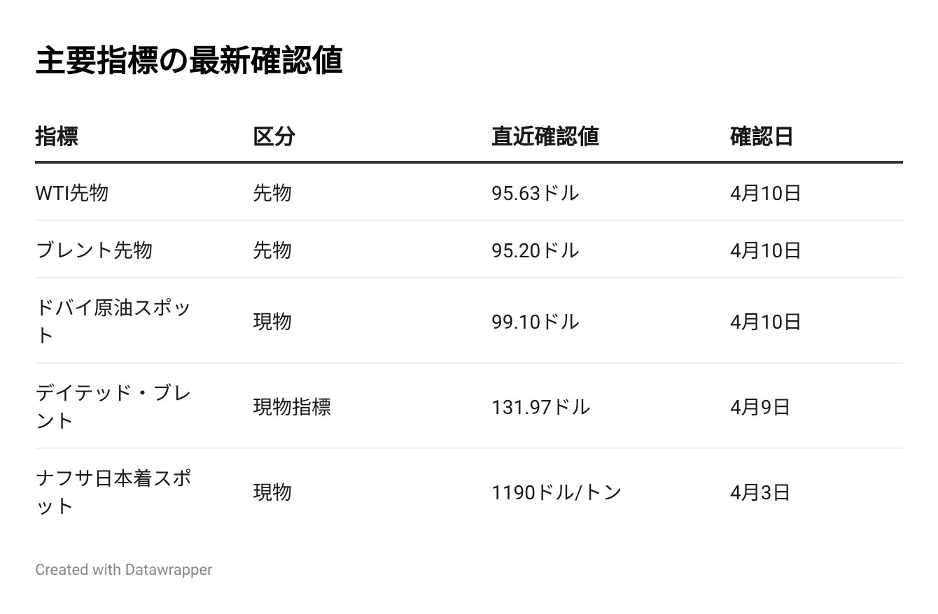 原油先物は停戦を織り込んだ。WTIは7日の117ドルから8日の94.41ドルへ1日で23ドル下落し、20年以来最大の日中下落幅を記録した。だが、現物市場は別の景色を見せている。S&Pグローバルが算出する現物指標のデイテッド・ブレントは、7日に過去最高の144.42ドルを記録し、9日時点でも131.97ドルにとどまった。先物と現物の乖離は35ドルを超えた。停戦合意後も物理的な供給逼迫が解けていないことを、現物市場がなお価格に映している。