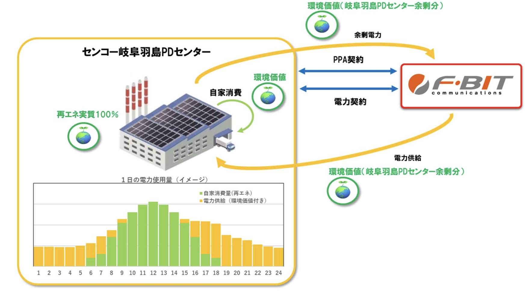 同センターでは2021年10月より、屋上全面に設置した1051キロワットの太陽光発電システムによるPPAサービスで自家消費を行ってきた。日中に消費しきれない余剰電力のデータを蓄積・分析した結果、センター全体の電力需要を継続的に賄える環境価値を創出していることが確認できた。今回のスキームでは、その余剰電力分の環境価値をエフビットコミュニケーションズの小売電気事業を通じて夜間などの時間帯にも同センターへ供給する仕組みで、使用電力を太陽光発電由来の環境価値で実質100%とすることが可能になった。
