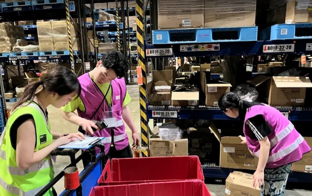 ▲マレーシアGDCでラベリング、ピッキング、パッキングなどの倉庫業務を体験するインターン生(出所:大創産業)