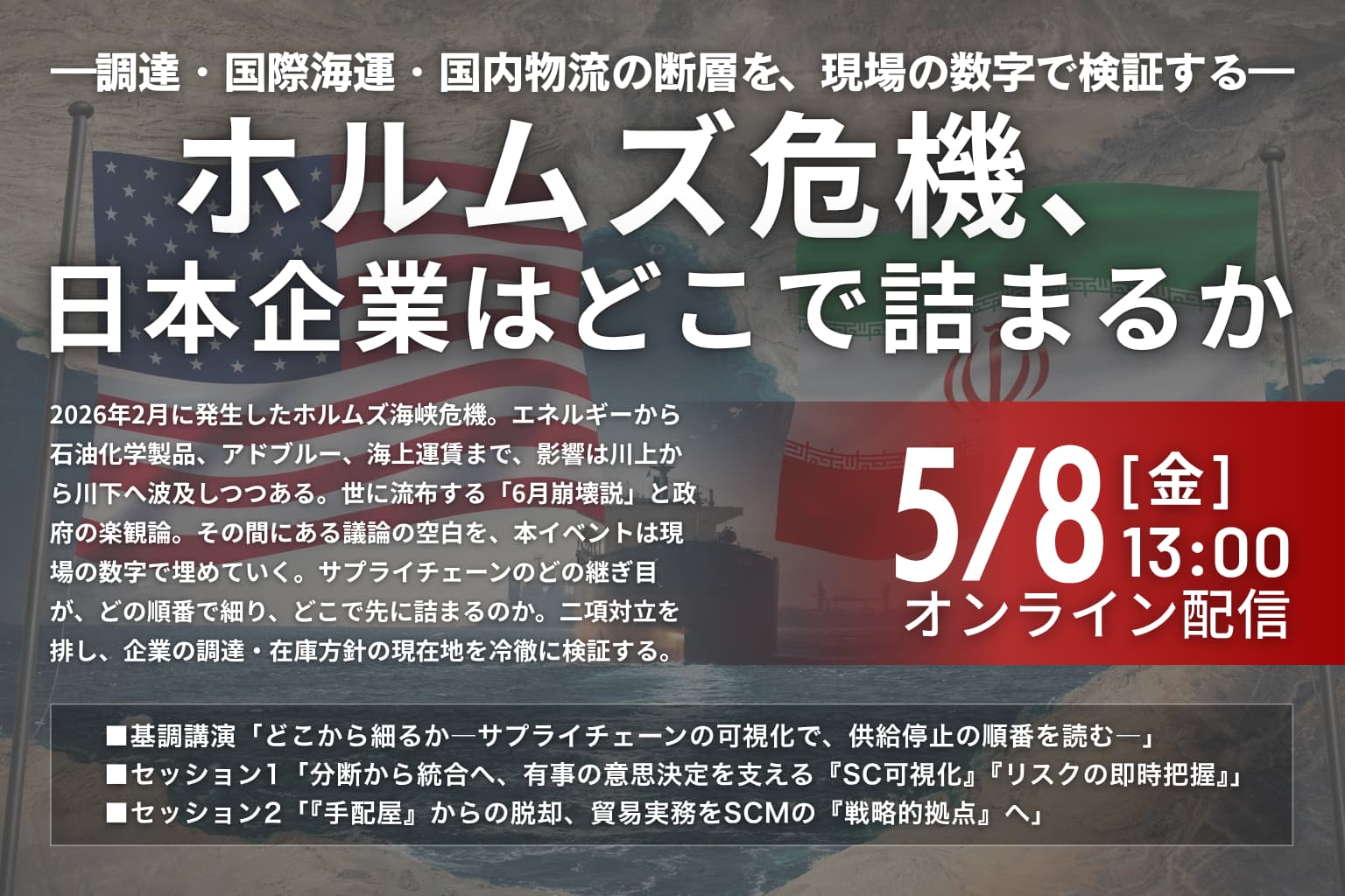 イベント2026年2月28日のホルムズ海峡危機発生から2カ月。LOGISTICS TODAYは5月8日、緊急オンラインイベント「ホルムズ危機、日本企業はどこで詰まるか―調達・国際海運・国内物流の断層を、現場の数字で検証する―」を開催する。基調講演は、地政学リスクをサプライチェーンのデジタル可視化から読み解く東京海上ディーアール チーフデジタルオフィサーの大野有生氏と赤澤裕介編集長の対談とした。