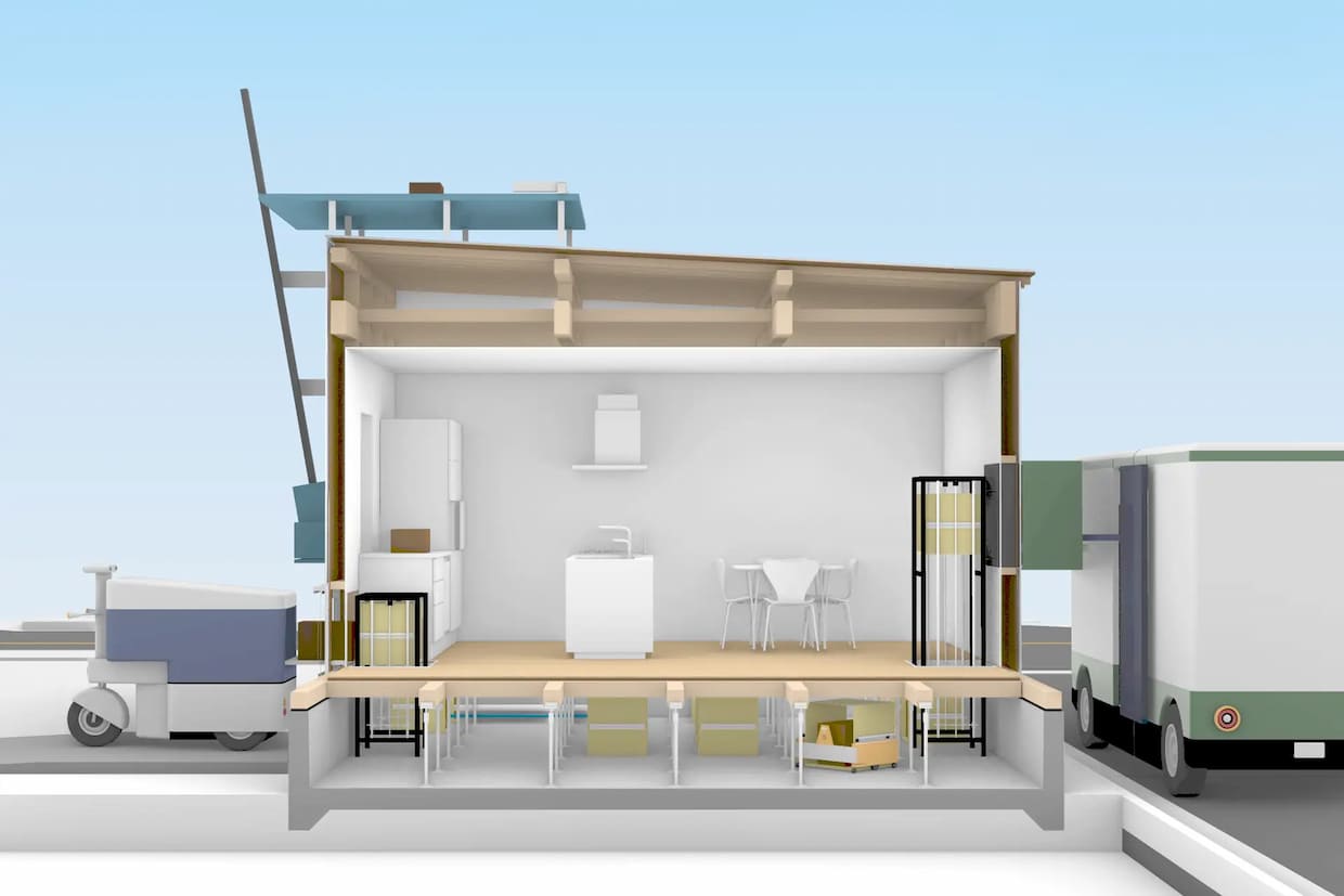 ロボット床下収納は床下で荷物の出し入れを行い、居住空間の収納スペース削減を実現する。自動配送ロボットポートはコンベアやエレベータ機構により荷物を室内へ搬送し、ドローンポートエレベータは屋根上で受け取った荷物を居住空間へ届ける仕組みとした。これらを組み合わせることで、複数荷物の受け取りや即時配送への対応も可能となる。