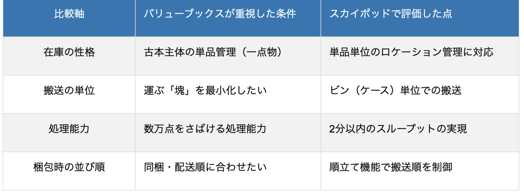 バリューブックスが「美しい」と評した中身は、ロボット単体のスペックではなく、業務の動きと搬送の動きがずれないこと、その一点にある。自らの言葉で鳥居氏はこれを「自分たちのプロセスに一番無駄なくフィットする」と定義する。埼玉新拠点の要件と、スカイポッドの評価点を並べると次のようになる。いずれも、単品管理の動きとロボット搬送の動きをずらさないための条件である。