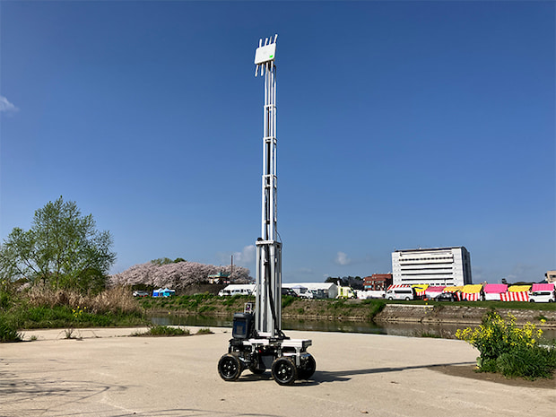 実証は福岡県直方市で開催されたイベントの臨時駐車場で4月5日に実施した。PicoCELAの無線メッシュ通信機とKiQ Roboticsの電動昇降ポールを組み合わせ、MITRAに搭載することで移動型基地局を構築した。これにより遮蔽物の影響を受けやすい環境でも通信の不感地帯を解消し、広域Wi-Fi環境を整備した。さらにアシストユウのエッジAI(人工知能)カメラを組み合わせ、リアルタイム映像伝送と車両認識による駐車場管理の有効性を検証した。
