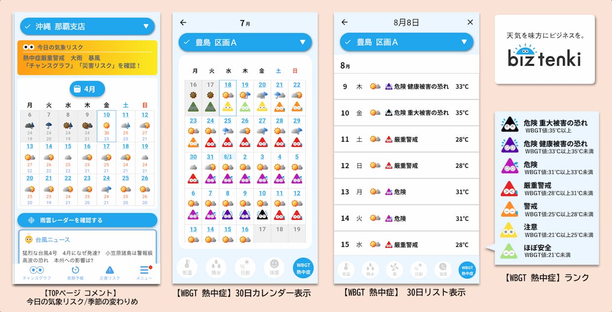 EC日本気象協会は20日、30日先までのWBGT(暑さ指数)情報をビジネス向け天気予報アプリ「biz tenki(ビズテンキ)」の新サービスとして提供開始したと発表した。