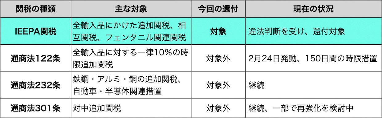 還付の対象はIEEPA関税のみだ。米国が輸入品に課している関税は大きく分けて4種類あり、今回戻るのは1種類にとどまる。言い換えると、1つの輸入申告に複数の関税が重ねてかかっており、そのうちの1つだけが削除される仕組みだ。