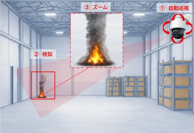 同システムは映像解析により火や煙の兆候を検知するもので、PTZカメラと組み合わせることで1台で広範囲を巡視しながら異常を検出できる。必要に応じてズーム確認も可能で、高天井施設や広い監視エリアでも早期把握を支援する。既設カメラの活用にも対応し、環境に応じた導入が可能とした。