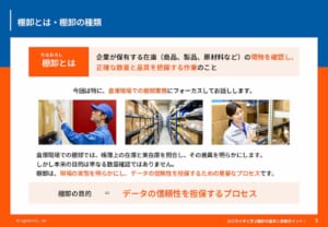 資料は2月26日に開催したオンラインセミナーの内容をもとに作成し、棚卸の種類や重要性、在庫差異が発生する要因、精度向上に向けた具体策などを整理した。あわせてクラウド型倉庫管理システム(WMS)を活用した棚卸業務の効率化・高度化についても解説している。