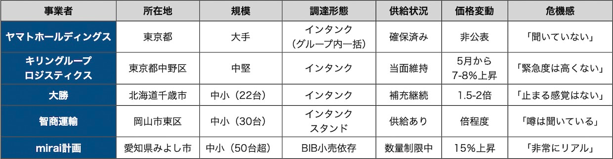 一方、BIB小売に依存する中小事業者では状況が異なる。愛知県みよし市の運送事業者、mirai計画の柳川佑平社長は「仕入れ先からすでに数量制限がかかっており、価格も15%ほど一気に跳ね上がった。供給が止まれば数日から1週間で車両稼働に直接影響が出る」と話した。岡山市東区の智商運輸の河合智哉社長も「値段は倍くらいに上がっており、近隣の運送事業者でアドブルーとエンジンオイルの入荷が滞ったという噂も聞いている」と証言した。これは規模の格差ではない。同じアドブルーへのアクセスを、調達経路が分断している。このアクセス格差が、稼働可否を分け始めた。