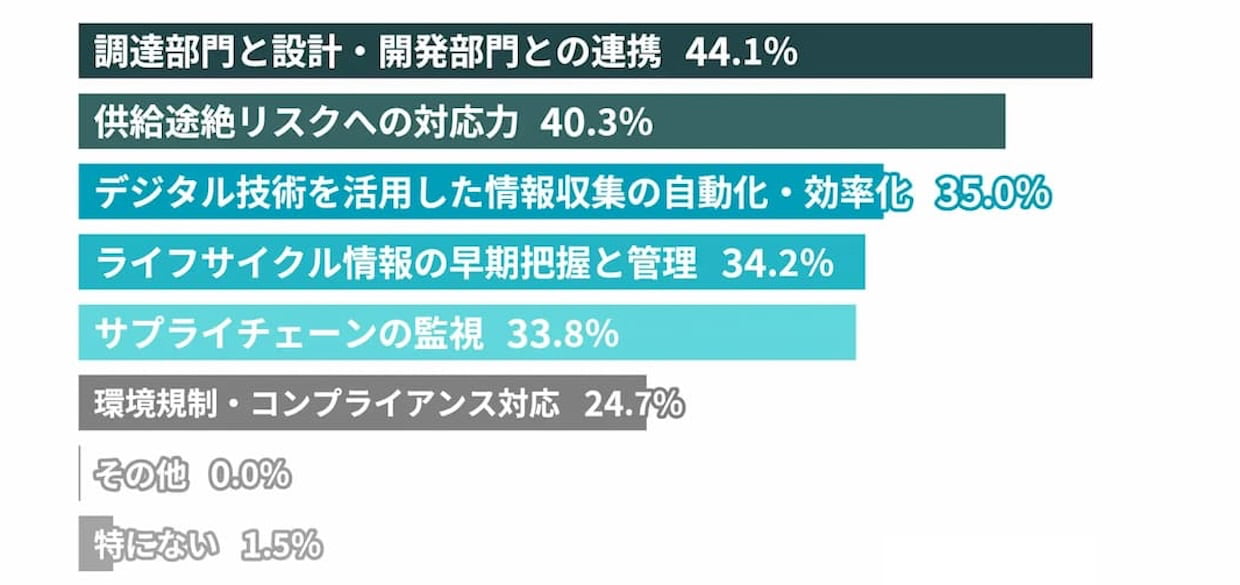 今後強化したい領域としては「調達部門と設計・開発部門の連携」(44.1%)が最多で、「供給途絶リスクへの対応力」(40.3%)、「デジタル活用による情報収集の自動化」(35.0%)が続いた。調達単独ではなく、設計段階から供給制約を織り込む動きが強まっている。