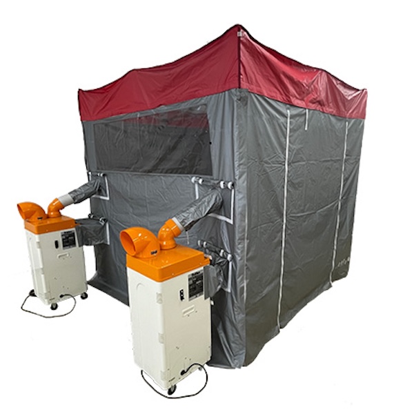 設営は2人で約6分と短時間で行え、軽量設計により移設にも対応。テントの連結によって規模に応じた拡張が可能で、天井高に制約のある現場でも設置できる。