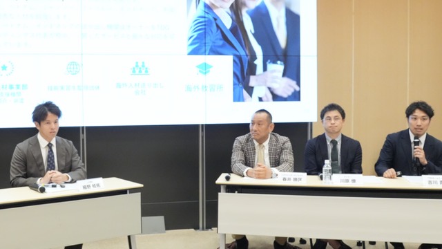 ▲(左から)X Mile DXソリューション事業本部物流DX事業部部長の細野桂佑氏 、シグマインターナショナルの春井勝匡社長 、タイミー地方創生グループチームリーダーの川原僚氏 、TDGホールディングス専務取締役の吉川貴教氏