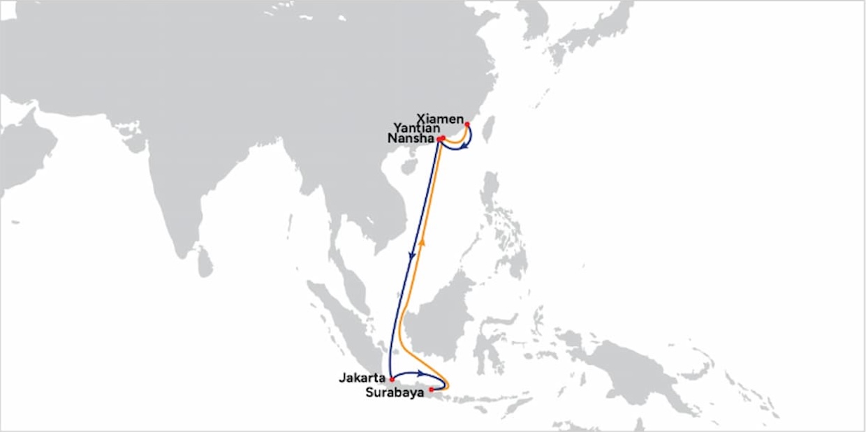 廈門市(中国)→南沙区(中国)→ジャカルタ(インドネシア)→スラバヤ(インドネシア)→塩田(中国)→廈門市(中国)
