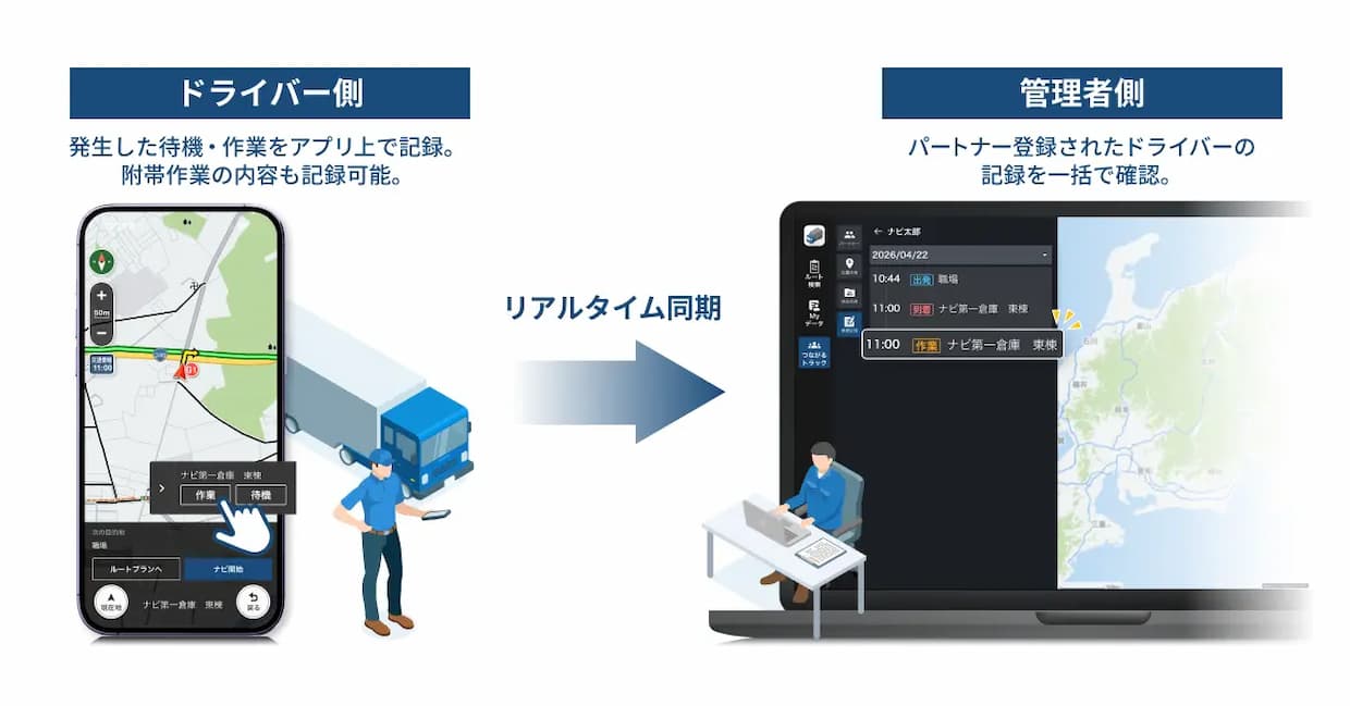 同機能は、輸送安全規則改正による待機・荷役時間の記録義務化や、4月施行の新物流効率化法への対応を目的に開発されたもの。ドライバーの記録負担軽減と、客観データに基づく運行管理の高度化を支援する。