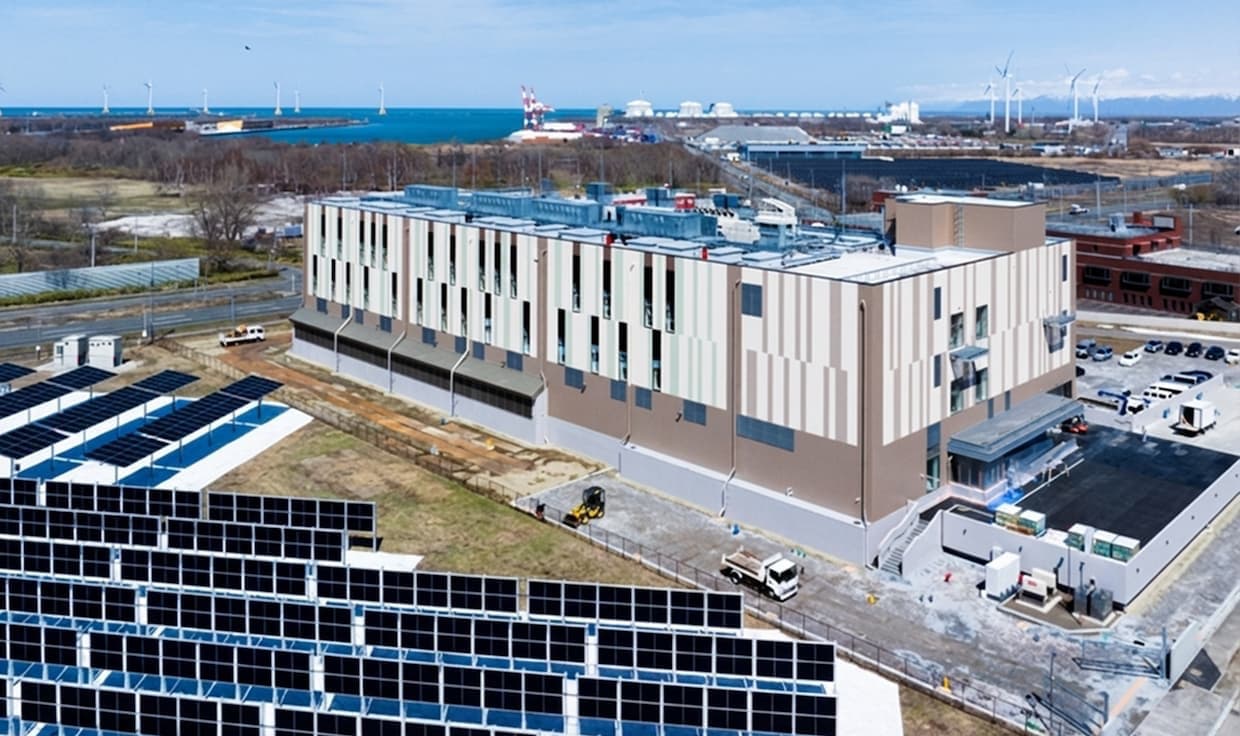 同データセンターは石狩市との協定に基づき、自営線を使って再エネ電力を直接供給するオンサイトPPA(電力販売契約)方式を採用。豪雪地帯でも高効率な発電が可能な垂直式太陽光発電設備を導入し、積雪時には地面からの反射光(アルベド効果)による発電量の向上も見込む。