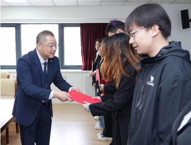 寄付講座ではNX中国 経営戦略本部業務部長の左竟成氏が「NX中国の組織体制とDX変革・イノベーション」をテーマに講演。奨学金授与式では26年度の受賞学生10人に証書を授与した。さらに新たな取り組みとして、受賞学生10人とともにキャンパス内に桜の木6本を植樹した。