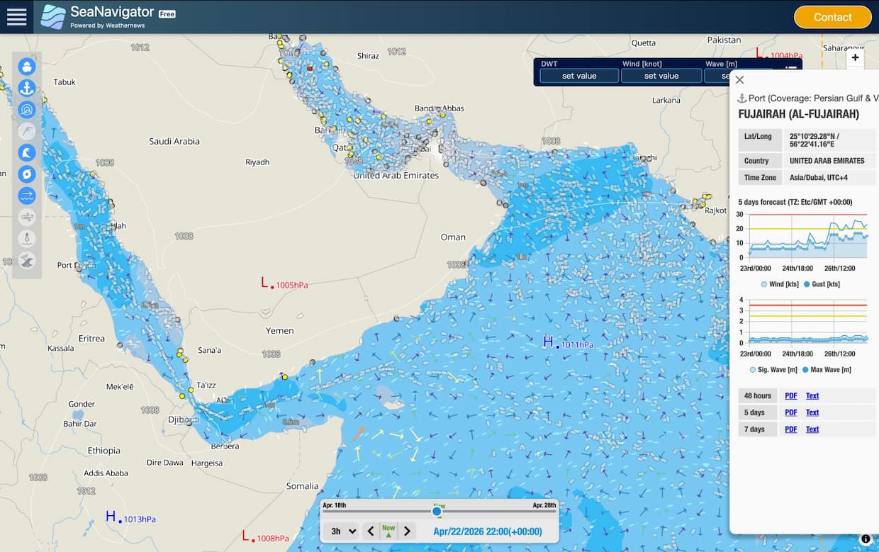 公開内容は、船舶の最新位置情報に加え、風向・風速、波向・波高、海面温度、熱帯低気圧などの海象・気象データで、5日先まで1時間ごとの予測を閲覧できる。データは4時間ごとに更新され、ペルシャ湾周辺を中心に140か所の港湾について、48時間先、5日先、7日先のピンポイント予測も提供する。これらは同社独自の「全球気象・波浪予測システム」に基づき、世界トップクラスの高精度と高解像度を実現している。