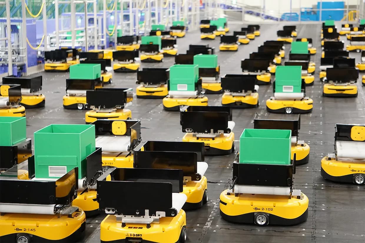 特徴は自走式ロボットを活用したピッキングシステムにある。従来はコンベヤー上を配送箱が流れる方式で、対象外の箱も作業者前を通過するため待機時間が発生していた。新センターではAGV(無人搬送車)を用い、必要なオーダーのみを作業者に搬送する方式へ転換。待ち時間の削減と作業効率の向上に加え、ピッキングミスの低減によるサービス品質向上を図る。