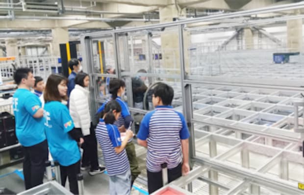 プログラムでは、自動仕分けを担う大型ソーターや、商品のピッキング・搬送を行うロボットなど最新の物流設備を見学したほか、実際にソーターへ荷物を投入する作業も体験した。車両見学では昇降機能を備えたトラックや大型車の運転席に触れ、物流現場の実務に理解を深めた。