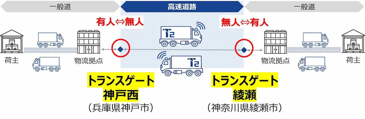 拠点・施設自動運転トラックの開発を手がけるT2(東京都千代田区)は24日、レベル4自動運転による幹線輸送の実現に向け、高速道路での無人運転と一般道での有人運転を切り替える拠点「トランスゲート」を神奈川県綾瀬市と兵庫県神戸市に設置したと発表した。物流事業者として国内初の取り組みで、実運用を前提としたオペレーション構築を本格化させる。