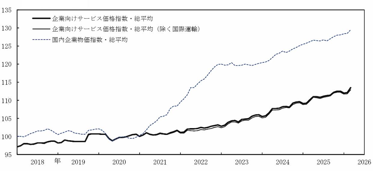 速報によると、総平均は113.5(2020年=100)となり、前年同月比3.1%増と上昇。前月比も1.2%増と伸びており、サービス分野全体でコスト上昇圧力が継続している。国際運輸を除いたベースでも前年同月比2.8%増と、広範な分野で価格上昇が確認された。