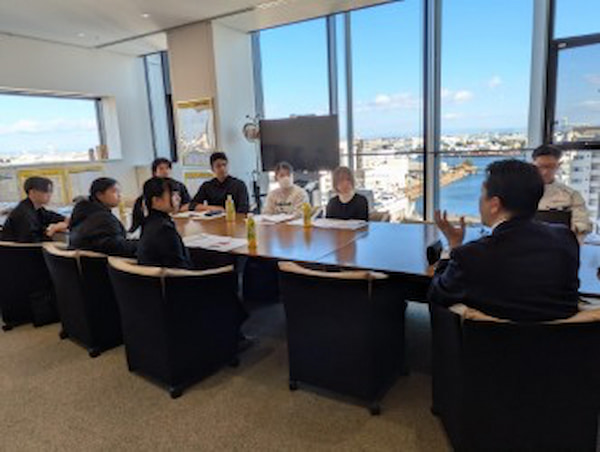 研修には学生7人が参加し、企業本社での説明のほか、卒業生社員との意見交換の機会が設けられた。その後、港湾エリア内を移動しながら物流現場の視察を実施し、自動車を船舶へ積み込む作業や大型船の出航など、海上輸送の実務を体験的に学んだ。訪問先企業は名古屋港を拠点に国内20か所に拠点を展開し、内航船17隻体制で自動車をはじめとする貨物輸送を担っている。研修では、港湾物流が単なる輸送にとどまらず、保管、荷役、輸送を一体的に運営する複合的な産業である点が強調された。