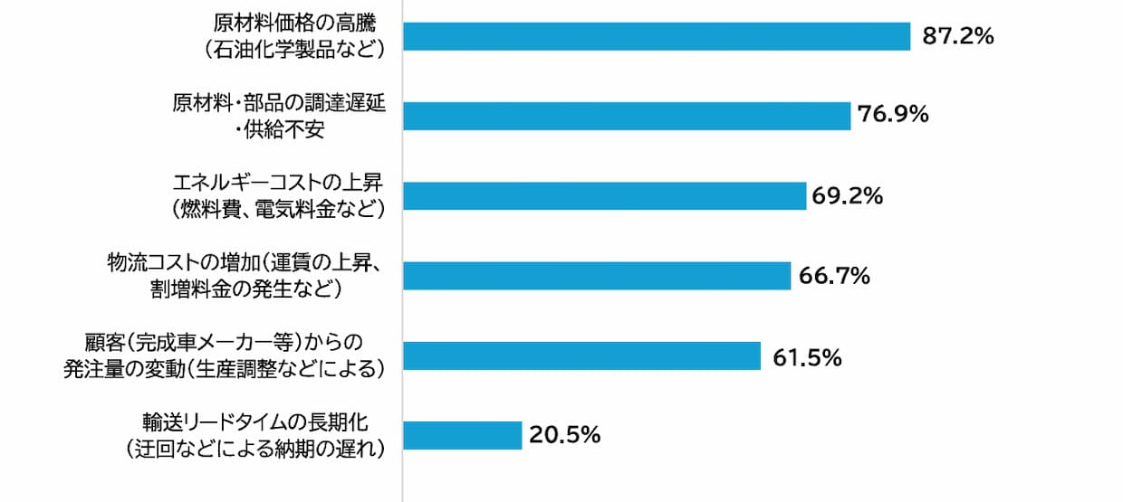 自動車関連企業の調査では影響はさらに深刻で、「影響がある」または「今後影響が予想される」との回答は92.9%に達した。具体的には「原材料価格の高騰」(87.2%)、「調達遅延・供給不安」(76.9%)、「エネルギーコスト上昇」(69.2%)に加え、「物流コスト増加」も66.7%と高い割合を占めた。発注量の変動(61.5%)や輸送リードタイムの長期化(20.5%)も確認され、需要・供給双方で不確実性が増している。