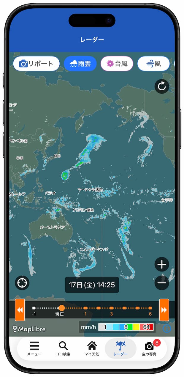 新バージョンでは全世界で「1キロメッシュ・5分ごと」という超高解像度の天気予報が利用可能になった。一般的な全球規模の雨雲予測が10キロメッシュ・時間単位であるのに対し、独自のAI(人工知能)解析により空間・時間ともに高解像度を実現している。雨雲レーダーも全世界に対応し、30時間先まで10分間隔の雨雲予測が可能だ。日本国内で人気の雨雲アラームも全世界対応となり、雨雲の接近をプッシュ通知で知らせる。