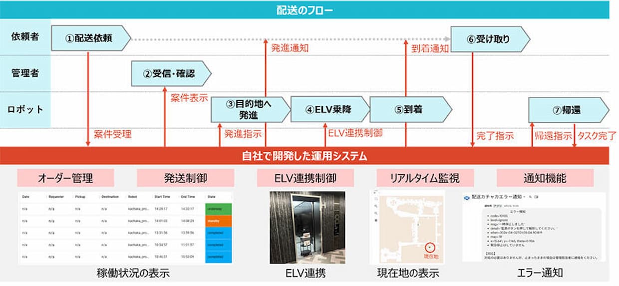 自社開発により実現した主な機能は4つだ。エレベーターとの連携による複数フロア間の自律移動、ロボットの位置・稼働状況のリアルタイム把握、エラー発生時の管理者への即時チャット通知、発進・到着時の依頼者への通知による配送状況の共有となっている。